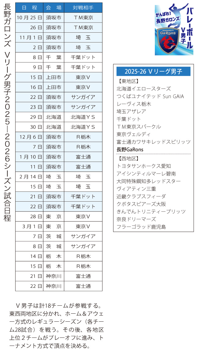 須坂市に拠点を置く長野GaRons(ガロンズ)は加戸隆司新監督の下、東地区で上位を目指す。開幕2連戦は、ホームの市民体育館でTM東京スパークルと戦う。