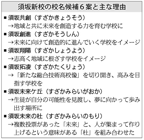 須坂共創が6票で最多。次いで須坂創進4票、須坂翔陽3票、須坂拓凌と須坂未来ケ丘は2票だった。須坂未来の杜は、同じく2票を集めた「の杜」から変更。1次投票で「未来」や「みらい」を含む案に複数の投票があったことから、事務局案として候補に加えた。