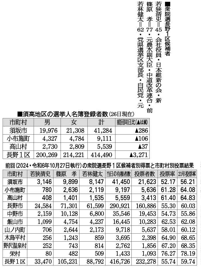 2024(令和6)年10月の前回選と同じ顔ぶれ。届け出順に日本維新の会新人の若狭清史氏(45、長野市)、中道改革連合前職の篠原孝氏(77、中野市)、自由民主党元職の若林健太氏(62、長野市)。3氏は共に比例代表に重複立候補した。衆議院定数は465(小選挙区289、比例代表176)。過半数は233。選挙戦は来月7日までの12日間。投開票は8日。